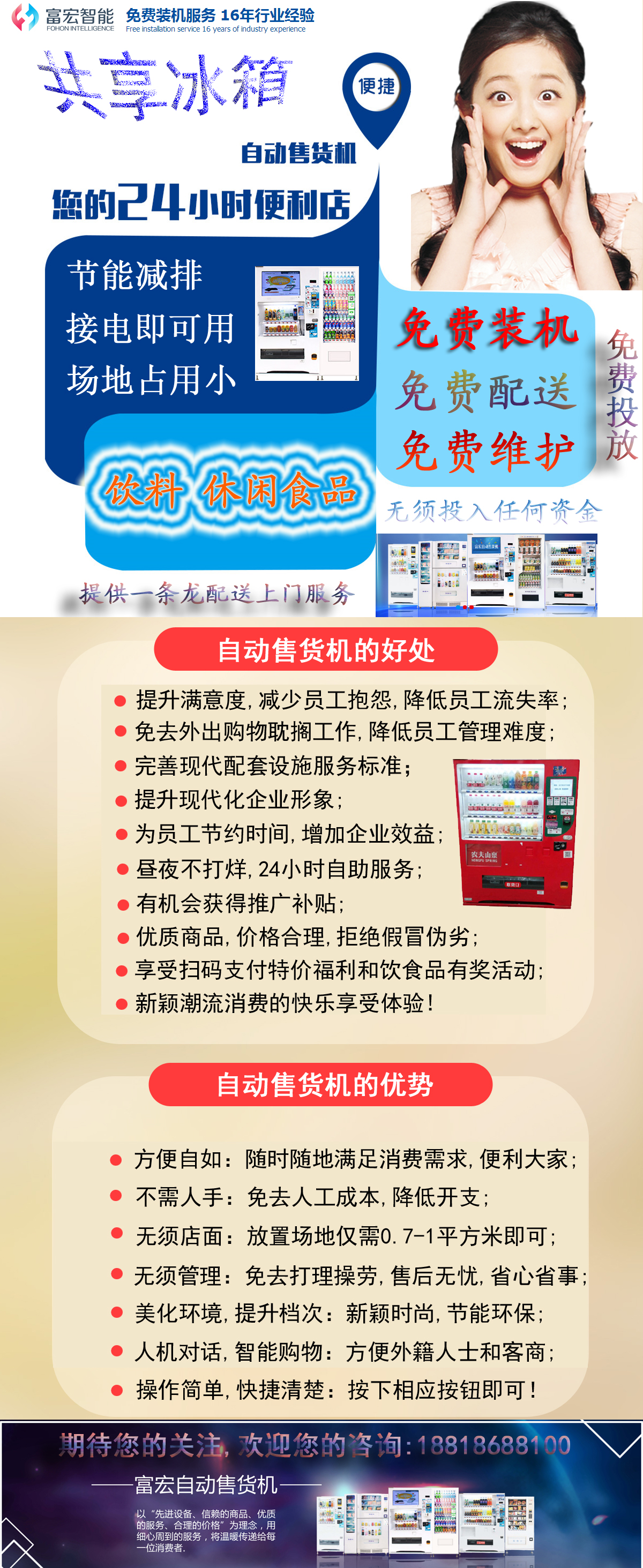 优点:不需人手、仓库的占用,无须采购、无须管理之麻烦,只需提供场地及电源,即可享有富宏自动售货机24小时的贴心服务。可使用钱币,可银联刷卡,可微信和支付宝支付,操作简单,方便快捷。